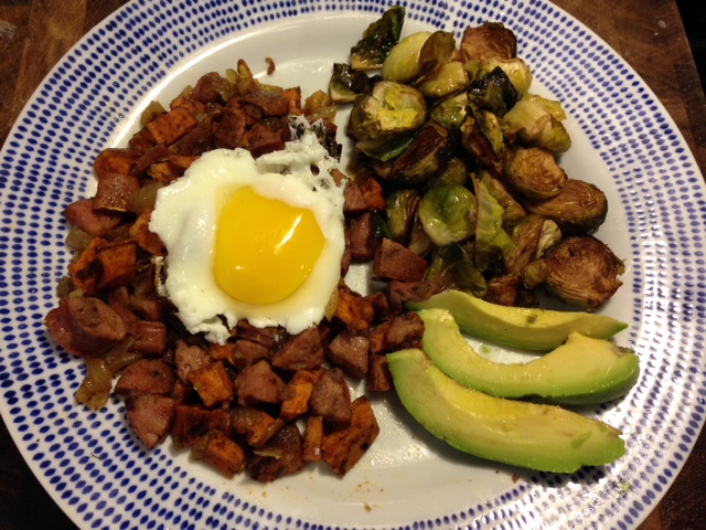 Breakfast: Sweet Potato and Chicken Sausage Hash with Roasted Brussels Sprouts, Avocado and a Fried Egg