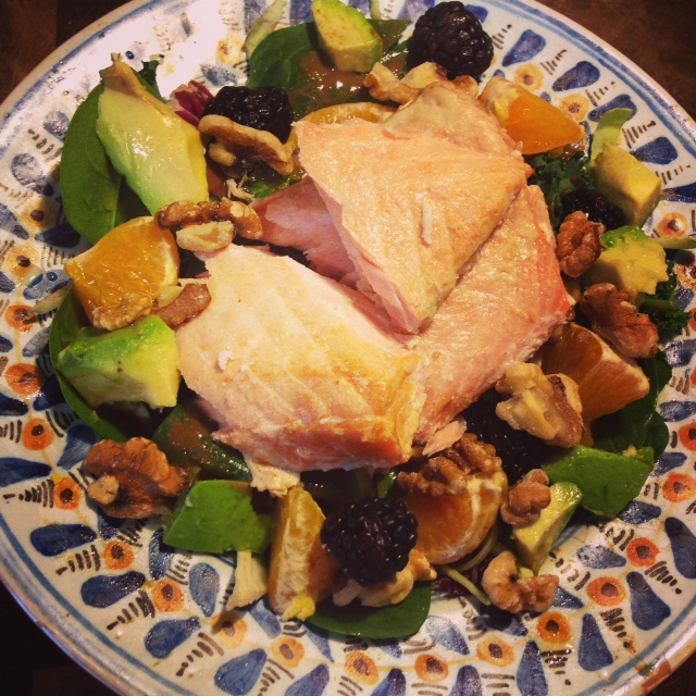 Lunch: Salmon, Avocado, Blackberries, Orange Slices and Walnuts over a Power Green Salad with Almond Butter Balsamic Dressing {OMG SO GOOD}