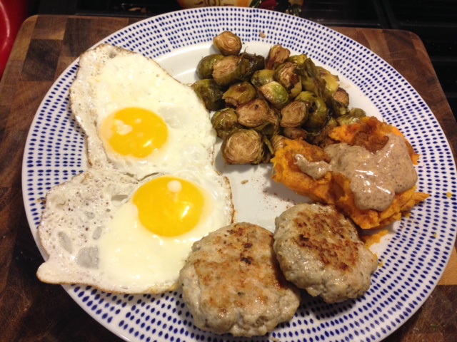 Breakfast: Fried eggs, homemade turkey sausage, Brussels sprouts and sweet potato with almond butter