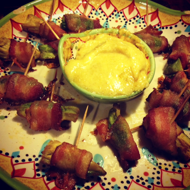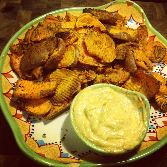 Dinner: Takeout Tuesday! Sweet potato fries with homemade mayo and bacon wrapped avocado as appetizers and a Sweet Green salad for dinner